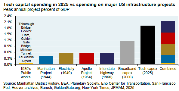 Through 2025, about 2.0% of our nation’s GDP was related to building out data centers, power sources, and applications for the continued expansion of AI in the world’s economy. This far outstrips the expansion of broadband capabilities a quarter-century ago. And, it is almost equal to the total expenditures of major projects (as a percentage of GDP) going back almost a century – the Depression-era public works, the Manhattan Project, the completion of a unified electrical grid and interstate highway system, and the Apollo moon landings. Incredible.
