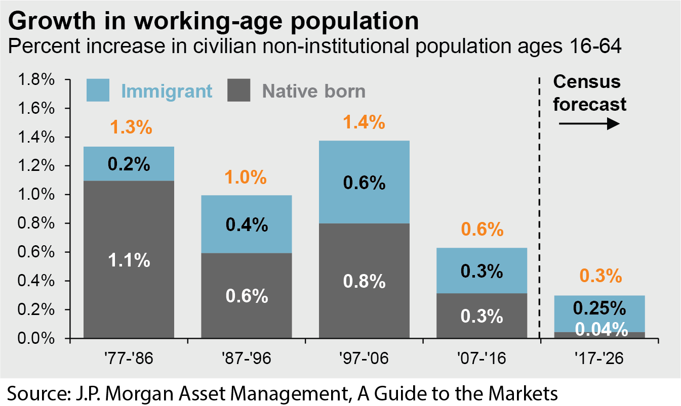 What happens next? We are early in a strong cyclical advance. The stage was set by years of accommodative monetary policies, boosted by recent changes in tax policies. We will be fine – for a while. But, eventually, demographics will catch up. Our society is not growing its workforce at a rate that is consistent 3.0%+ secular GDP growth. Again, look below.