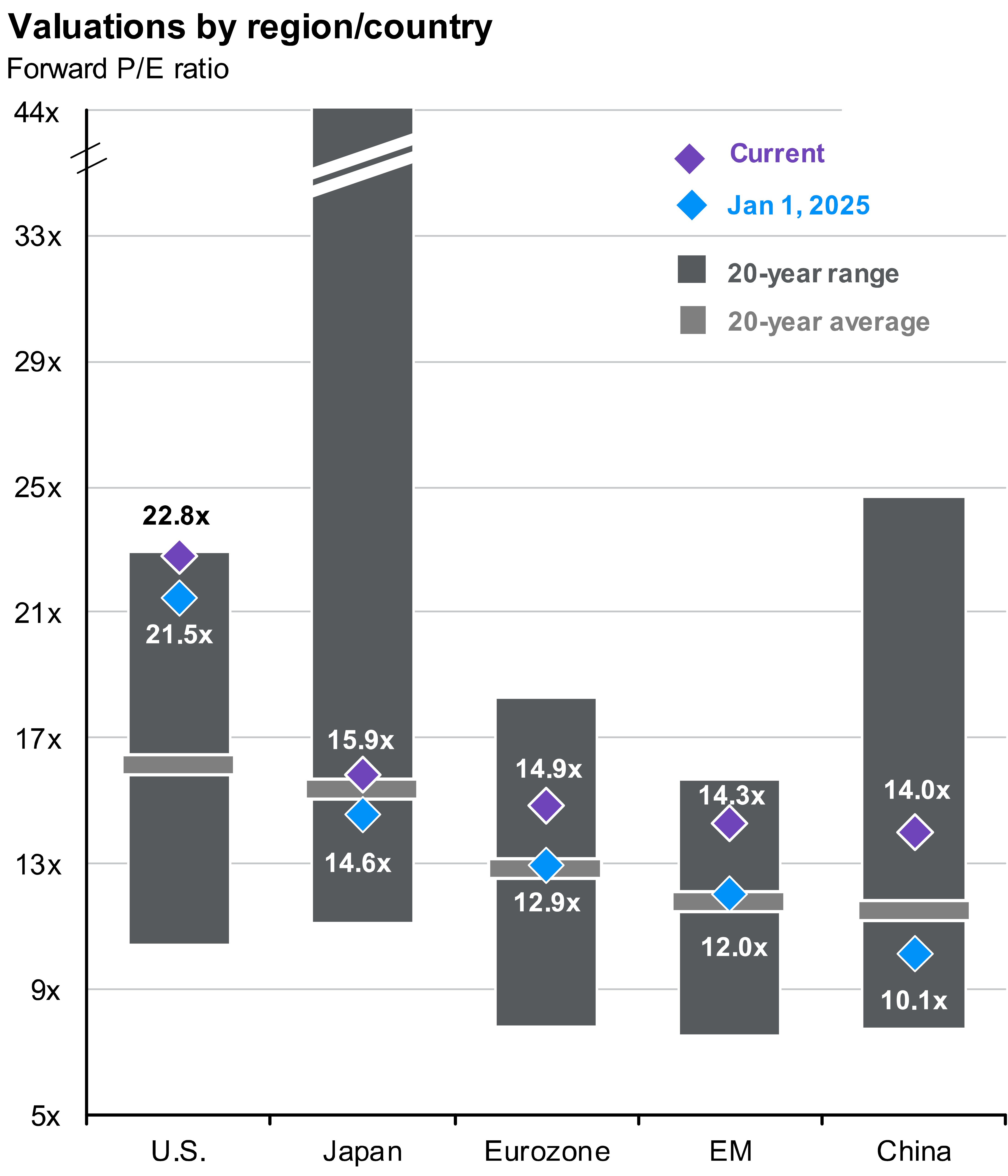 In this case, multiples refer to forward P/E (Price-to-Earnings) ratios, a valuation metric used to determine if a stock is priced attractively. As evident with the chart below, U.S. stocks started the year with higher valuations, making international stocks look relatively “cheap” to investors. Cheap valuations, combined with regional tailwinds, have supported gains abroad. This is due to corporate reforms in Japan aimed at prioritizing shareholder returns, NATO members’ increased military and infrastructure spending in wake of the Russia-Ukraine war, Taiwan’s semiconductor leadership in the AI boom, and Chinese stimulus through lower lending rates and AI enthusiasm. While the valuation gap has narrowed between the U.S. and the rest of the world, it remains historically wide.