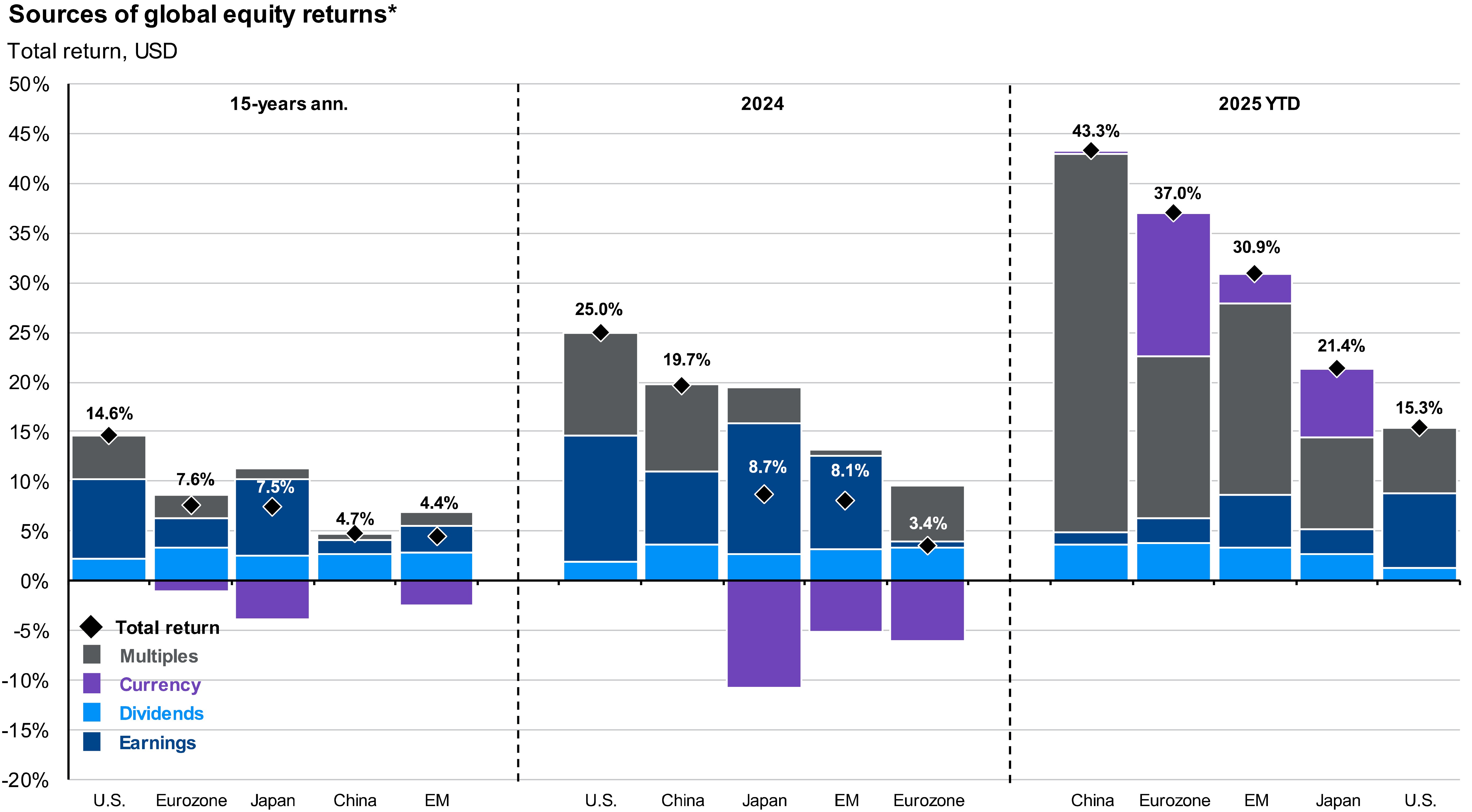 It is a good time to revisit my January commentary on U.S. exceptionalism now that we are three quarters through 2025. As a refresher, at the start of the year, many expected U.S. stocks to outpace international markets, citing stronger consumer spending and higher corporate profitability. While those trends remain intact, U.S. exceptionalism has not played out as anticipated. In fact, international stocks (MSCI All-Country World Index ex-U.S.) are on pace to outperform domestic stocks (S&P 500) this year. This has only happened three other times since 2010. If we examine year-to-date sources of global equity returns, as illustrated below, the clear drivers of international outperformance are multiples (the grey bars) and currency (the purple bars).
