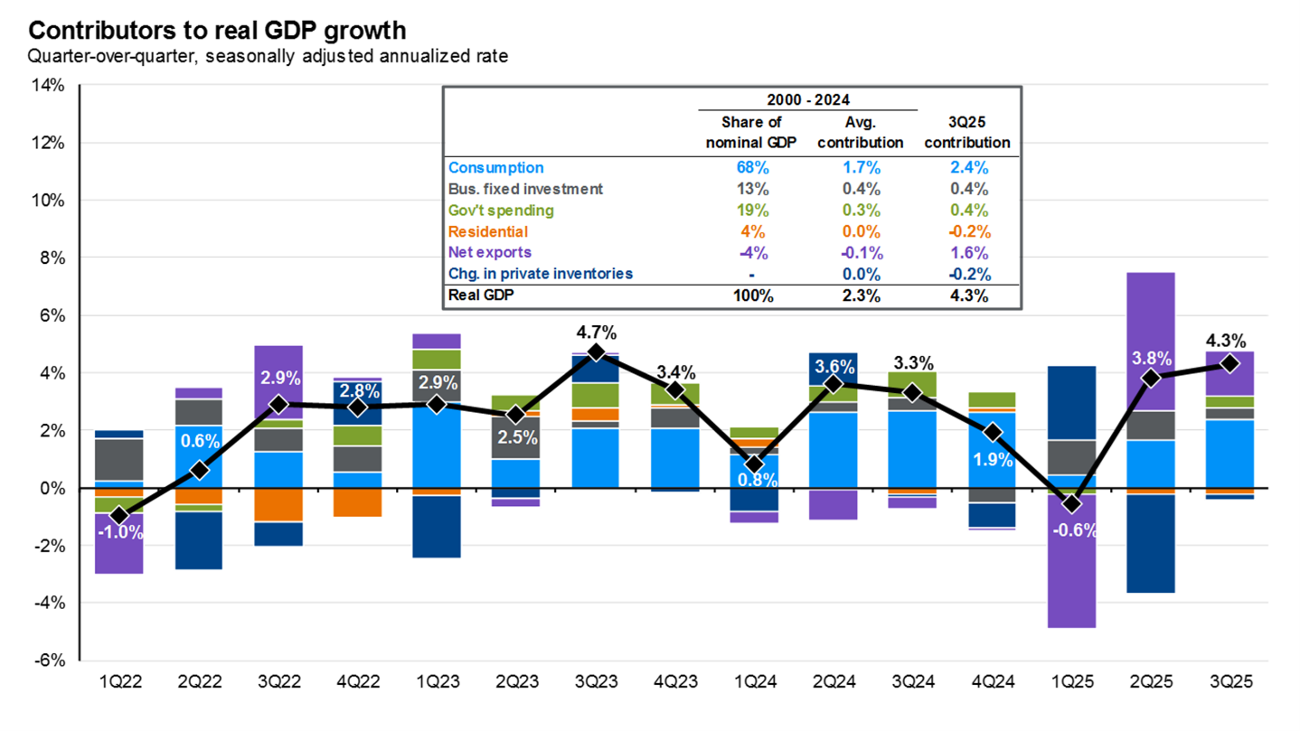 The chart below highlights why this matters. Gross Domestic Product (GDP), a measure of overall economic growth, reflects the total value of goods and services produced in the U.S. The chart breaks down the contributors to GDP growth from 2000 through 2024, with consumer spending highlighted in light blue. Over this period, personal consumption has accounted for roughly two-thirds of U.S. GDP growth, underscoring the central role that consumer spending plays in driving the economy.