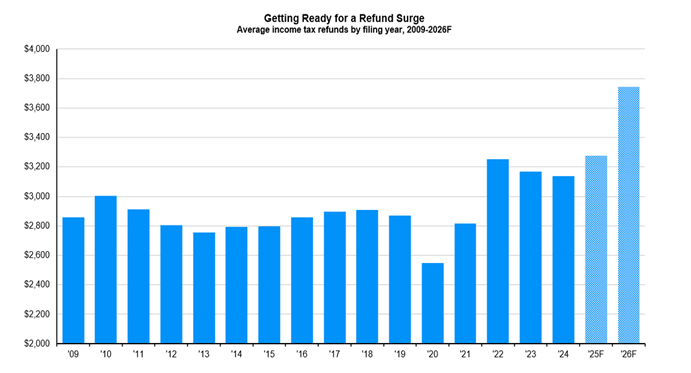 Happy New Year everyone! I hope you were able to take time to celebrate with friends and family and enjoy the many festivities that come with ringing in a new year. One of the most recognizable events of New Year’s celebrations is a spectacular fireworks show, lighting up the sky as we turn the page on the calendar. This year, those fireworks might extend beyond January 1st. A fuse appears to be burning under the U.S. economy, as projections for increased tax refunds set the stage for a burst of consumer spending in the first half of 2026.