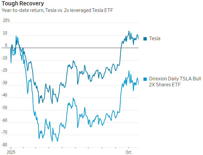 When Tesla fell 40% earlier this year, the leveraged fund fell about 75%. Tesla’s stock needed a 67% rebound to recover while leveraged fund would need a 300% gain.