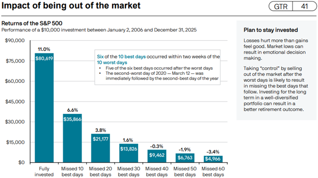 This quick recovery is not uncharacteristic of markets. In fact, some of the best days in the market occur shortly after the worst days. The chart below looks at performance of $10,000 invested in the S&P 500 over the past 20 years and highlights a common issue with panic selling: missing some of the best daily returns. Over this period, six of the ten best days occurred within two weeks of the ten worst days. The two bars on the left show that missing just the ten best days significantly alters long-term performance, with an ending portfolio value of $35,866 compared to $80,619 staying fully invested.