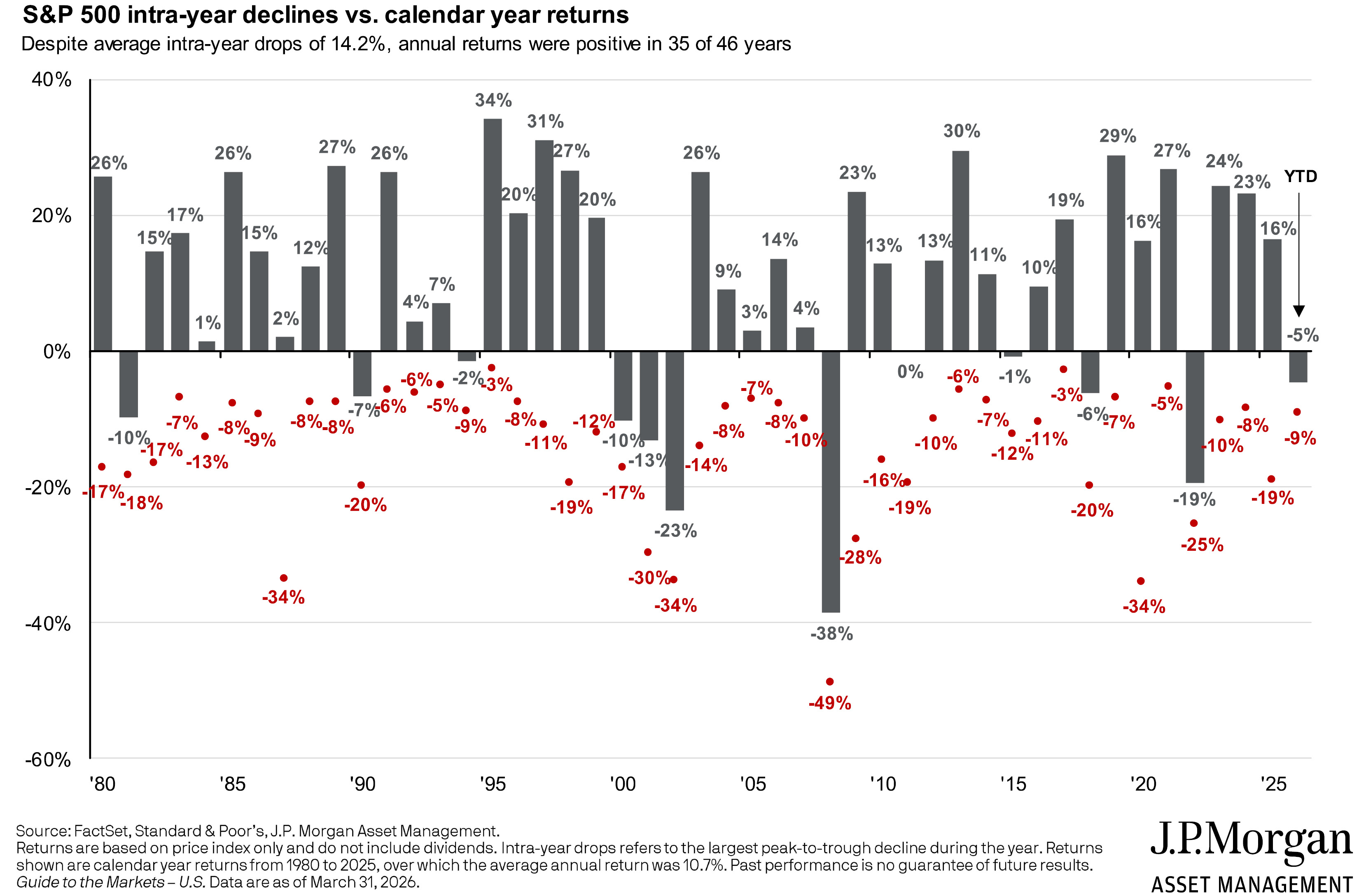 After starting the year positive and optimistic, financial markets retreated and the S&P 500 ending the first quarter down almost 5%. While declines can feel unsettling, they are a normal part of investing. The chart below, provided by J.P. Morgan, shows that despite an average intra-year decline over 14%, the S&P 500 finished positive 35 of the past 46 years. Even last year, markets retreated nearly 20% after tariff policy changes but still finished the calendar year with double digit gains. Rarely does the mission go according to plan in the short term, however investors who stay disciplined and focused are often rewarded.