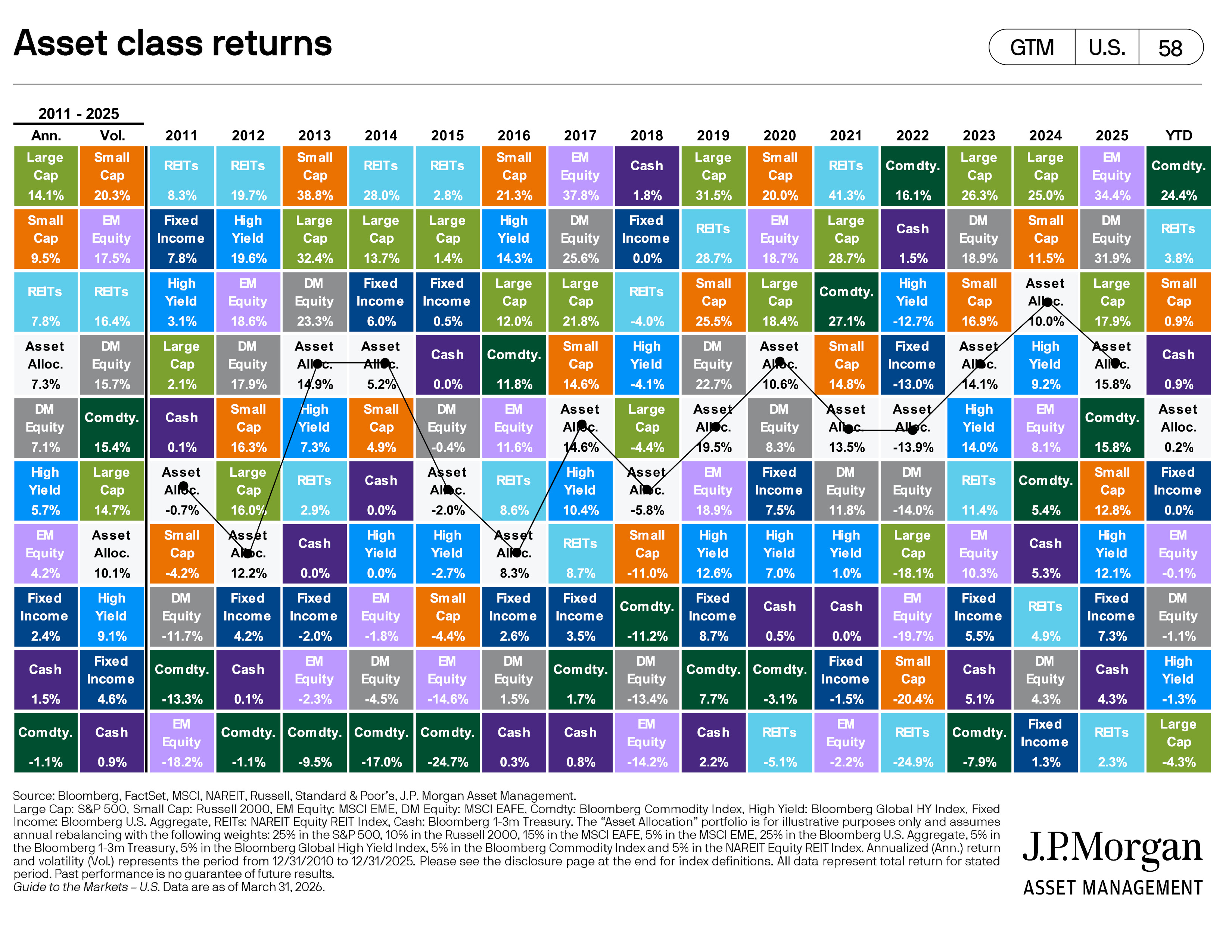 One of the most effective ways to control volatility is through diversification. The chart below, also provided by J.P. Morgan, shows the annual returns of various asset classes. One thing you will notice is leadership constantly rotates. For example, last year’s top performers (international and large cap equities) are among this year’s laggards, while real estate (which trailed in 2025) is one of the few asset classes with positive performance in 2026. The takeaway being, it is very difficult to consistently predict how asset classes will perform any given year, but maintaining broad exposures helps capture opportunities while reducing overall volatility.