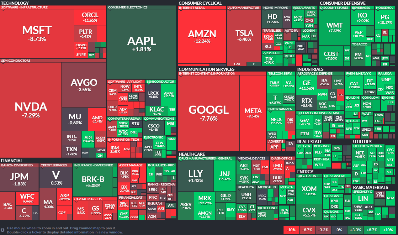 Interestingly, these selloffs led to heightened volatility within the index while the overall index remained relatively stable. The chart below from Finviz provides another perspective on this dynamic. In the chart, the size of each box represents the company’s weight in the S&P 500, while the color represents the stock’s return during February. Overall, most boxes are green (positive returns); however, many of the large boxes and industry groups mentioned above are red (negative returns).
