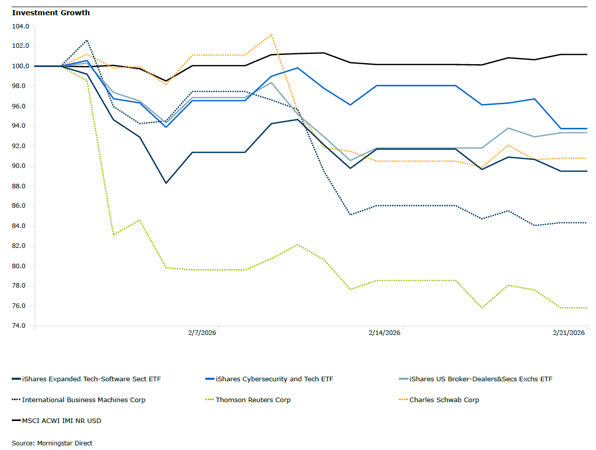 Early in the month, Anthropic introduced a new tool, Claude Cowork, an AI agent. Following the announcement, many software-as-a-service companies saw sharp declines. A few weeks later came Claude Code, which sent software and cybersecurity stocks lower. Other industries directly affected in February included private credit, insurance brokers, real estate services, and logistics. The chart below from Morningstar shows several examples of companies and industries that declined sharply following the introduction of these new AI tools. We see steep declines in both the early and middle parts of the month following the Claude releases.