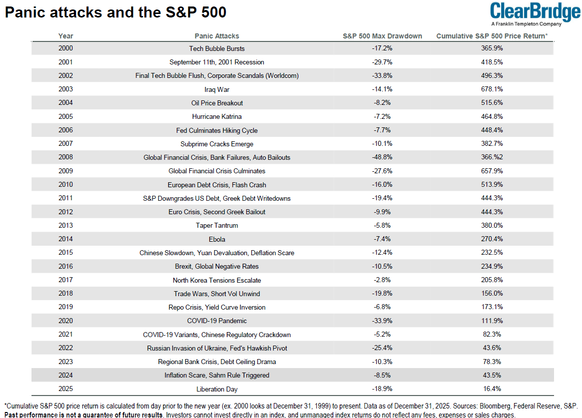 The chart below from ClearBridge highlights a couple of dozen market shocks over the past 25 years. It shows the initial market decline and the subsequent total return. There are two key takeaways from the chart. First, market shocks are common. Second, despite a mix of modest and steep declines, markets have historically recovered and moved higher over the long run.