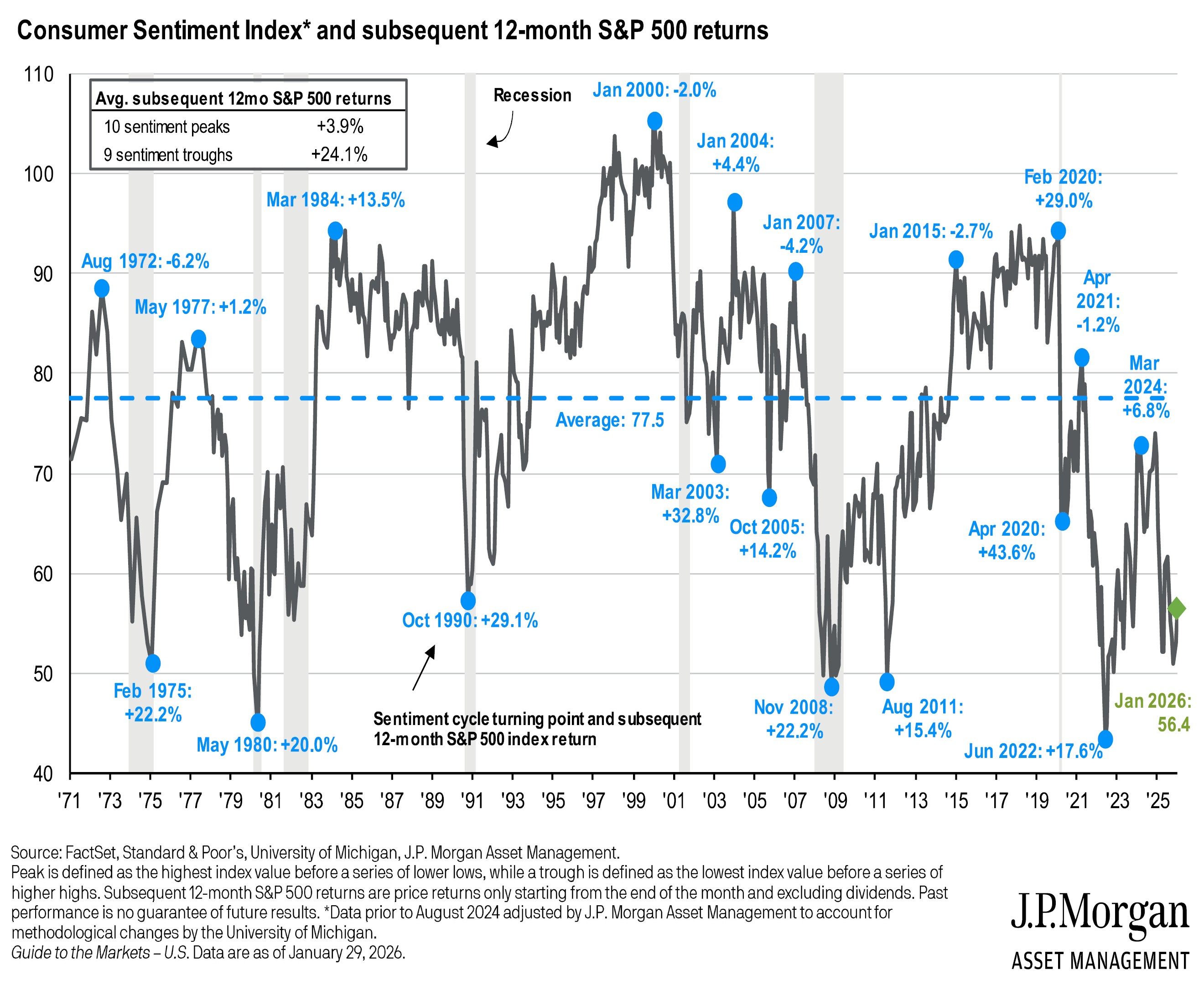 Revisiting Buffett’s quote from earlier, times of extreme consumer fear often prove beneficial for investors. The chart below, provided by JP Morgan, highlights consumer confidence surveyed by the University of Michigan and corresponding returns in the US equity market. Over the last 55 years, the data reveals a striking pattern, when the consumer is feeling their best the average subsequent 12-month return is under 4%. However, when the consumer is feeling their worst the subsequent 12-month return averages over 24%. Highlighting the reality, it is not as bad (or as good) as it seems.